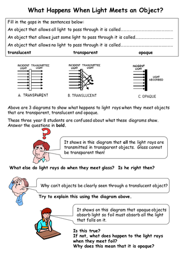 Transparent, Translucent, or Opaque Worksheet 5 based on 3 votes Share this worksheet Before starting this exercise, it might be useful to remind your students what transparent objects, translucent objects, and opaque objects are.