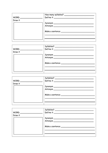 Handouts, Printables, Worksheets Add to cart Wish List Vocabulary Worksheet (Blank) by kbergner 11 $1.00 PDF This is a vocabulary worksheet that can be used as a master copy. Students write the vocabulary word on the arrow and write the definition on the lines in the box. It's two pages to copy back to back. This can be used for any story.