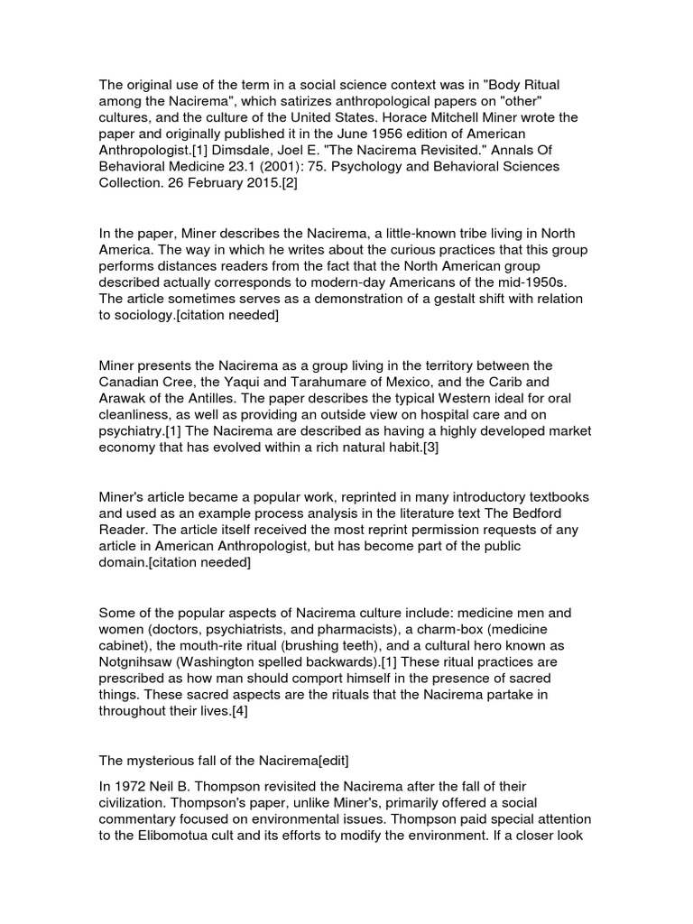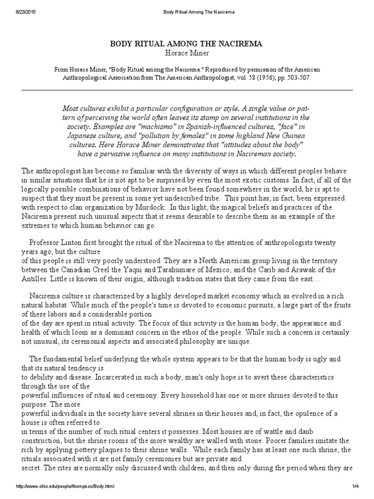 body ritual among the nacirema Revised from "Body Ritual Among the Nacirema" by Horace Miner, American Anthropologist Magazine 58(3), 1956, pp. 503-7 The ritual of the Nacirema was first brought to the attention of anthropologists twenty years ago, but the culture of this people is still very poorly understood.