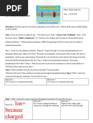 Answer in red Cell Defense The Plasma Membrane Directions: Read the steps here and all the information on the iPad screen. Follow all the steps carefully filling in all the blanks. Step 1: Click touch here to begin the app. You want to move to the " Choose Your Challenge!" menu. From the menu choose "Build a Membrane!" Dr. Vial has a vile weapon (note the play on words) that destroys ...