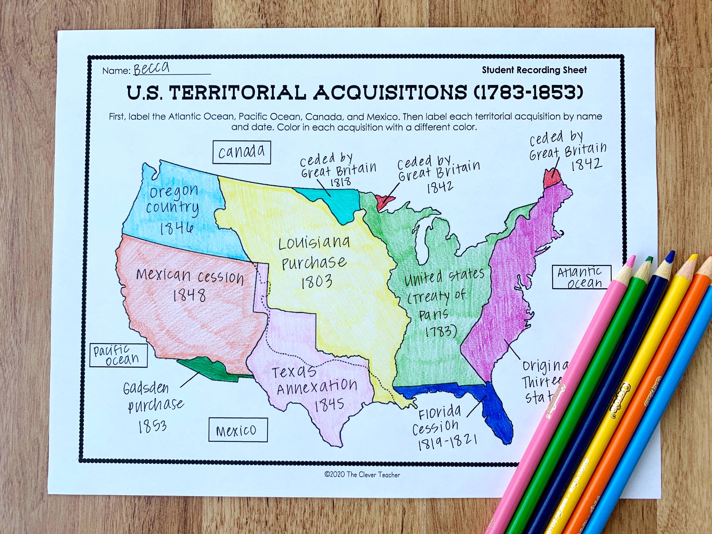 Apr 8, 2021 - Print the map worksheet. The key to the worksheet is included on the preview. The bottom of the student worksheet list the following items for students to label: Rocky Mountains Atlantic Ocean Oregon Trail Mormon Trek Northwest Territory Lousiana Purchase (1803) Florida Annexed (1819) Annexation o...
