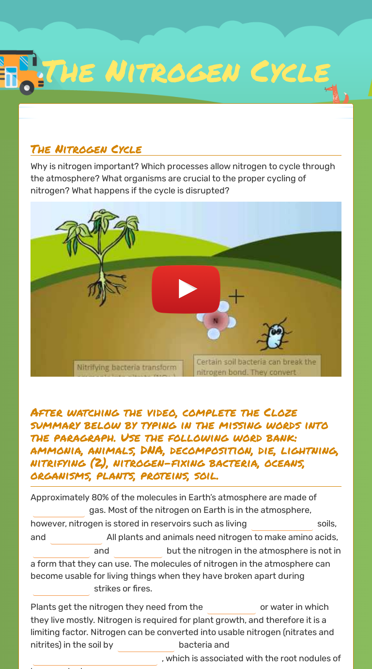 The Nitrogen Cycle Student Worksheet Answers as Well as Funny Nitrogen Cycle Steps Nitrogen Cycle Animation Video. The Nitrogen Cycle is important to a variety of animals and plants on Earth. Plant life utilizes these cycles to create nutrients, such as nitrogen, to grow and reproduce. The process also produces food, such as nitrogen-rich ...