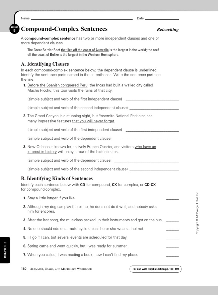 Compound complex sentences worksheet with answer key. These worksheets are perfect for simple compound and complex sentence practice or assessment. Answer keys simple compound complex sentences displaying top 8 worksheets found for this concept. A subject and a predicate. Click the buttons to print each worksheet and answer key. PART 4: SIMPLE, COMPLEX, COMPOUND, AND COMPOUND-COMPLEX SENTENCES So far, you have encountered only simple sentences (sentences with only one principal clause) and ... Diagram these sentences in the same way as in the example sentence. The answers follow. 1. During the era of steam locomotives, Canada built a railway across the continent. Simple, Compound, and Complex Sentence Worksheets Related ELA Standard: L.3.1.I Answer Keys Here Sentences are the life blood of written thought and communication. Often the grammar and structure are just as important as the information we are sharing. Without proper form, the reader will have difficulty understanding the thoughts of the author.