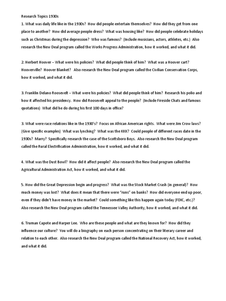 The Great Depression Questions and Answers - Discover the eNotes.com community of teachers, mentors and students just like you that can answer any question you might have on The Great Depression Tell the students that the class is beginning a unit on the Great Depression. 2. Distribute a copy of the Great Depression: An Overview and tell students to read the first five paragraphs. Ask students, based on their reading, why people should study the Great Depres-sion. (It was the worst economic catastrophe of the 20th century. * The Great Depression to WWII. Great Depression Perspectives. Visit the links for each perspective and fill in the corresponding graphic organizer. Economic Questions. 1. List the economic causes of the Great Depression? 2. What was the major economic cause of the Great Depression? 3. Did all economic reforms help the Great Depression ... The Great Depression: The Wall Street Crash of 1929 and Other Causes. Worksheet. 1. Why were the 'Roaring '20s' a prosperous period? GNP grew at an annual rate of 5%. Unemployment never surpassed ...