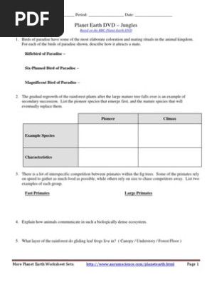 Planet earth jungles worksheet. Jungles: Directed by Alastair Fothergill. With David Attenborough, Sigourney Weaver, Huw Cordey, Nikolay Drozdov. On 3% of the Earth's surface, the rain forest is the habitat for half our animal species, even 80% of insects. So its wildlife is most competitive, like the birds of paradise's mating, and specialized with unique relationships of predation, parasitism etc. BBC Planet Earth: Jungles Episode. Editable Video Worksheet to keep your students on task and organized. Great for a sub day. Two pages of questions with an answer key. Jungles Companion worksheets for the BBC documentary Planet Earth Jungles . The Planet Earth series produced by the BBC spans the globe, ... Mangroves, peat bogs, jungles, marshes, sea beds, kelp forests, swamps, coral reefs, they take carbon out of the air and lock it away. Nature is a tool we can use... Much of our planet has been damaged. But nature can regenerate and we can help ecosystems bounce back. We need to stop funding things that destroy nature and pay...