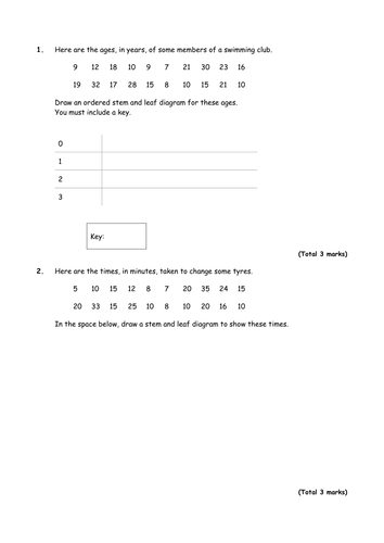 Stem and Leaf Diagrams Worksheets. free KS3-4 (11-16 year olds) Write-on Worksheet split into three sections, reading values from stem and leaf diagrams; drawing stem and leaf diagrams and calculating averages from stem and leaf diagrams. One version has more structure to it. Now also included are versions with the keys on. Reviews