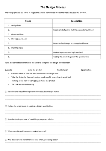 Engineering Design Process ( Summary Worksheet. 1. Needs Analysis: Problem Statement: Identify the underlying need fully and abstractly (without implying a solution). > Order of Magnitude Calcs: Make calculations based on estimates, to further understand the problem and its feasibility. > Start studying Engineering Design Process. Learn vocabulary, terms, and more with flashcards, games, and other study tools. ANSWER. The engineering design process is a series of steps that engineers use to help come up with a solution to an engineering problem. What are some things you need to know in order to solve a design problem? ANSWER. You must define the problem, including listing all of the criteria and constraints. Engineering design process worksheet due no due date points 100. The engineering design process helps engineers and other problem solvers come up with creative solutions. Pdf 1 53 mb this introducing the engineering design process worksheet was designed for middle school students learning about the engineering design process for the first time ...