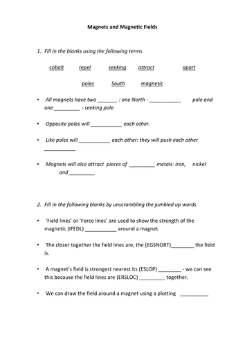 Magnets and Magnetic Fields - Worksheet - Fill in the blank. by. Mercury Manufacturing. 13. $1.50. Word Document File. This worksheet is a fill in the blank and is all about magnets and magnetic fields which includes: permanent magnets, electromagnets, electric fields, magnetic fields, magnetic lines of force, north and south poles ...