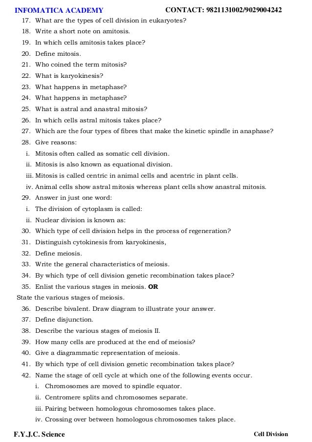 Cell Division and Reproduction Worksheets ... Cells have cell cycle checkpoints that regulate progression from one phase of the cell cycle to the next. _____ 15. Compared to normal cells, cancer cells have exceptionally slow cell division rates. ... 5 1.1 : Multiple Choice Name: _____ Date : _____ Circle the letter of the correct choice. 1. The ...