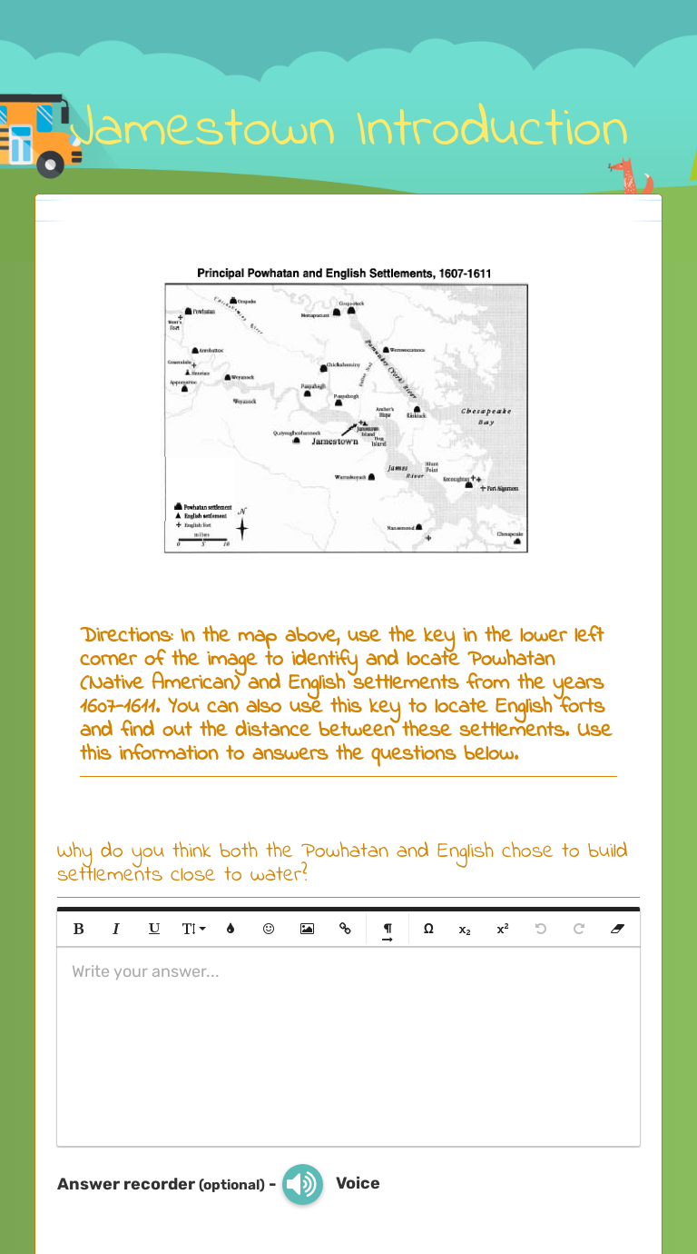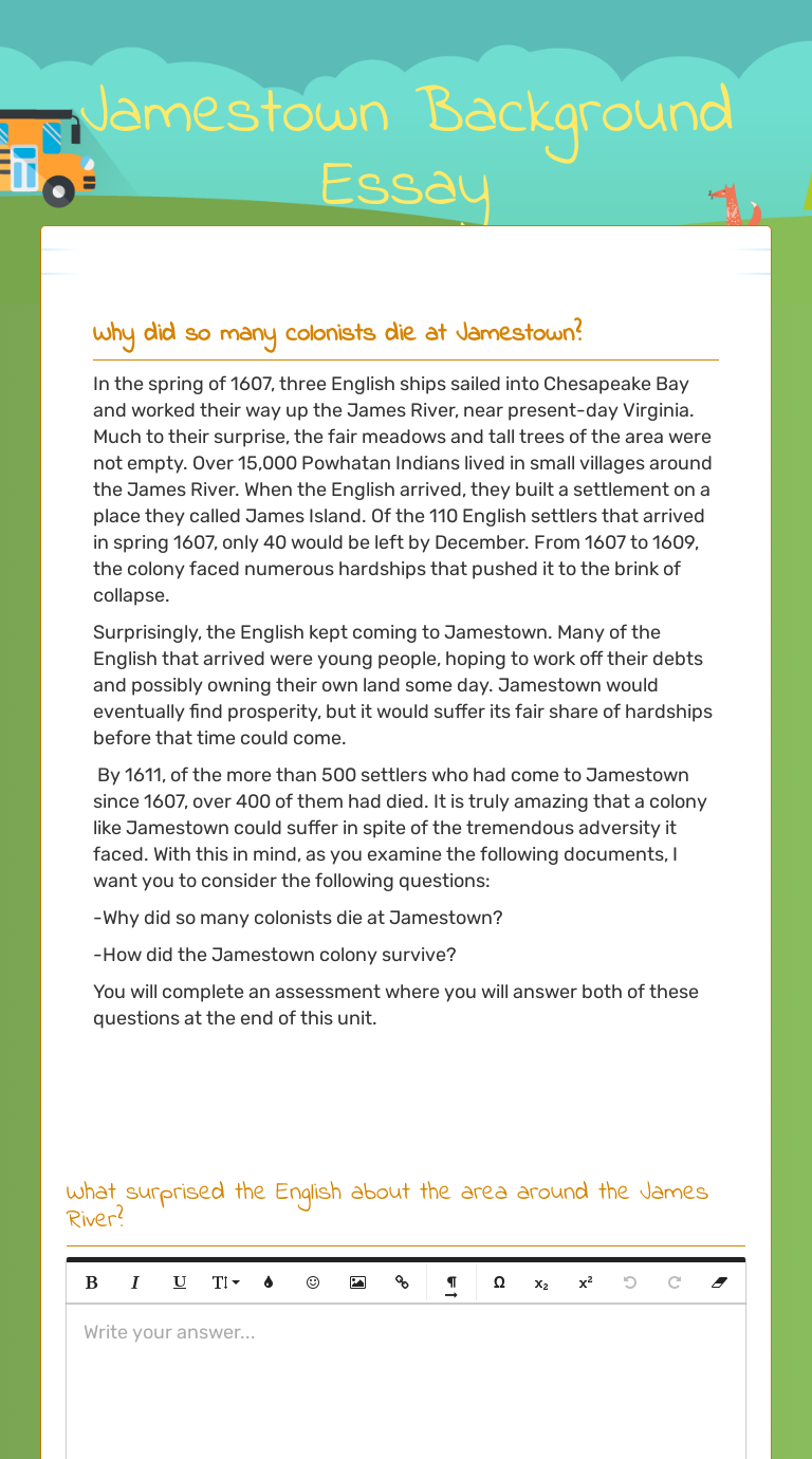 An english settlement at jamestown worksheet answers. Jamestown was primarily an economic venture. Virginia Company of London financed or paid for the settlement of Jamestown. Standard VS.3b: SWBAT describe how geography influenced the decision to settle at Jamestown. When settlers arrived in 1607, Jamestown was located on a narrow peninsula. Today it is located on an island in the James River. What was the name of the first permanent English settlement in America? Jamestown. Where was it located? What year was it founded? Virginia; 1607. What ... Aug 27, 2021 · The english at them to an issue the point comfort; in which document written remarks, saved their answers will be an english settlement at jamestown worksheet answers. 1st successful English settlement Jamestown Virginia 1607 Founded as a joint stock company. Dec 11, 2018 - Sail back in time to Jamestown, the first permanent English settlement in North America, with this fun, fact-filled worksheet.