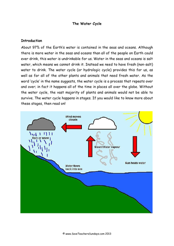 This water cycle worksheet is a great learning resource for geography lessons. After adding eight labels to the correct place on a coloured diagram of the water cycle, children are asked to write a paragraph explaining the water cycle in your own words. They are given a short prompt of a few words to help them begin writing this.This water cycle worksheet is a lovely way to teach your ...