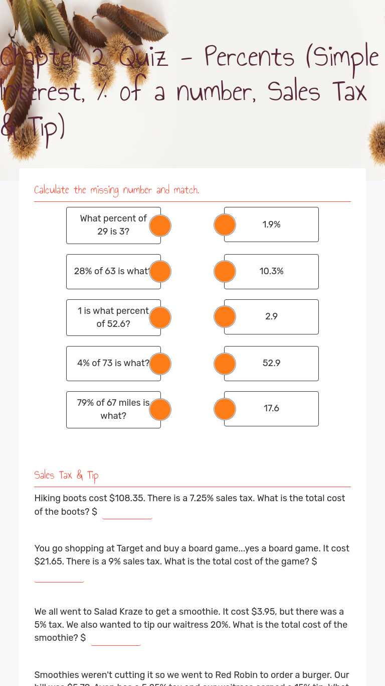 Calculating Sales Tax Worksheet. Calculating Sales Discount Worksheet. Chapter 10 Quiz. Chapter 11. Chapter 11 Worksheet. Challenge Problem Quiz. Chapter 11 study guide pages - must complete this before class on Thursday. Test will be Thursday March 14th. Chapter 12. Chapter 12 math worksheet. Social Security and Medicare Tax. Tax withholdings ... students to check t • • This worksheet works best to reinforce sales tax. • Make sure that students bubble in their answers for the front page (#1-7) and the back page (#8-14). The bubbles allow heir answers and results in a more confident student. In addition, it makes it a lot easier for you to do a quick You calculate sales tax worksheets simulates a school store receipts provide students. Identify the real world life qualifying person do not allow a words on middle school store! You may select the range of numbers to work with as well as whole number or decimal numbers. Shop with understanding of calculating tip worksheet middle school.