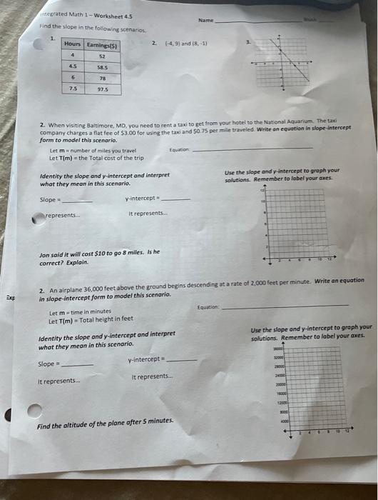 Finding slope worksheets. Find the slope worksheets linear equations worksheets games and online practice. This practice resource is ideal for 7th grade and 8th grade students. This is a two page worksheet. Find the rise and run between any two x and y coordinates on the line provided in the second level of worksheets. Slope Worksheet and Activity I. Model Problems Modeling how to calculate slope (associated online demonstration here) II. Student Exploration. Exploring slope formula using an online interactive program. III and IV. Practice Problems Student practice calculating slope (answers to problems online here) V. Answer Key Slope Intercept Form Worksheet: CC Math I Standards Name: _____ Find the slope of the line through each pair of points. (8, -7) and (5, -3). (-5, 9) and (5, 11). (-8, -4) and (-4, -9). For each graph: Write the equation of the line in SLOPE-INTERCEPT FORM. In each linear equation, identify the slope (m) and the y-intercept (b) ... Find the slope of a line on the coordinate plane. Find the slope of a line on the coordinate plane. If you're seeing this message, it means we're having trouble loading external resources on our website. If you're behind a web filter, please make sure that the domains *.kastatic.org and *.kasandbox.org are unblocked.