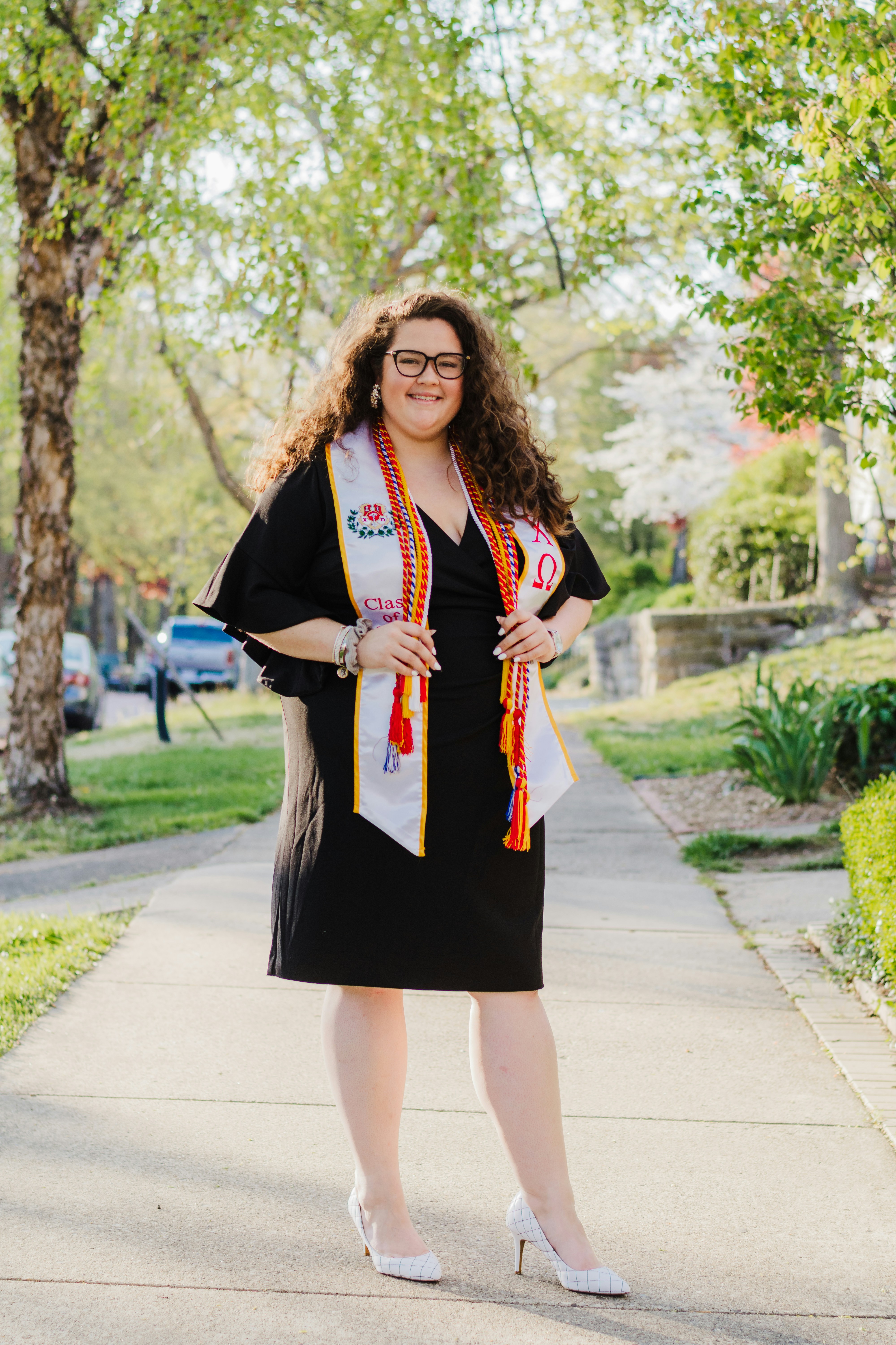 senior college graduation photography poses funny happy smiling cap and gown sorority chi omega honors cords glasses outdoor natural light curly hair black dress plus size