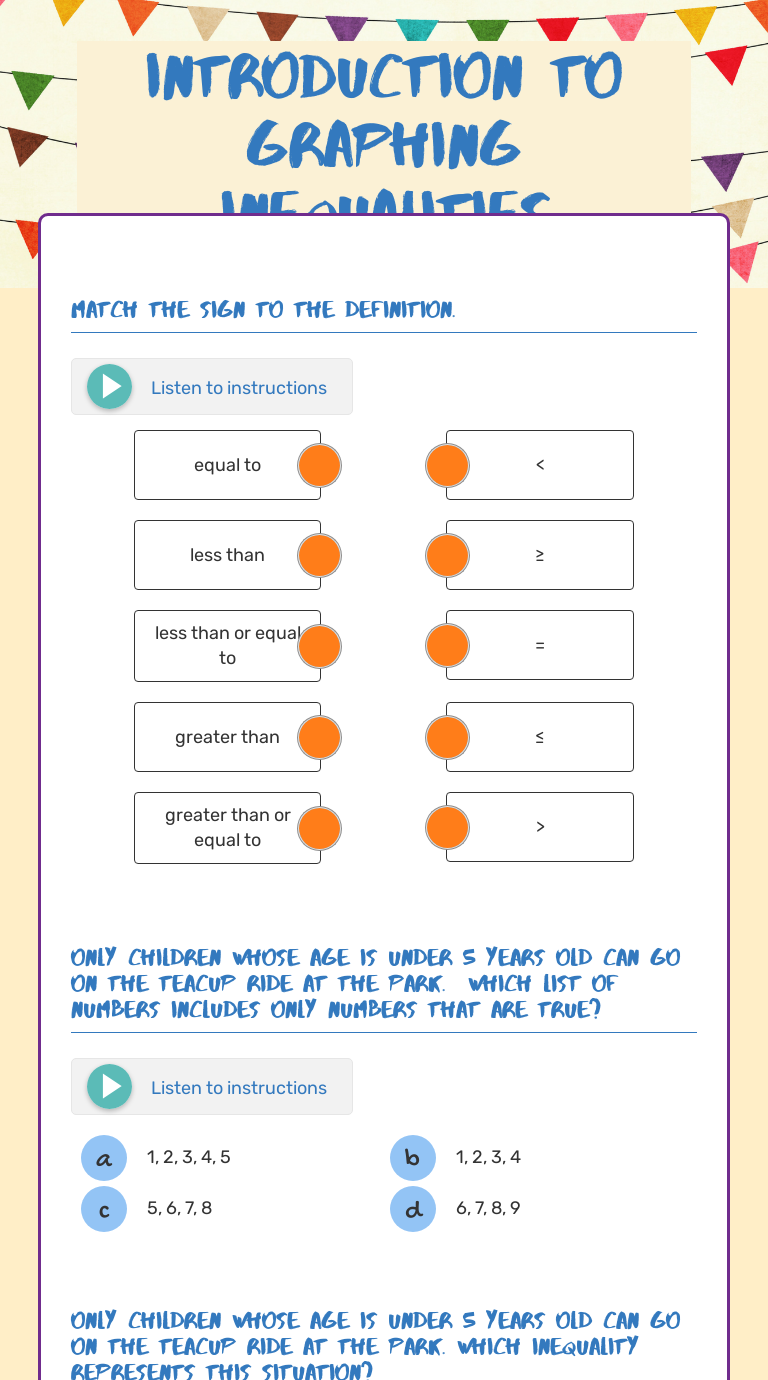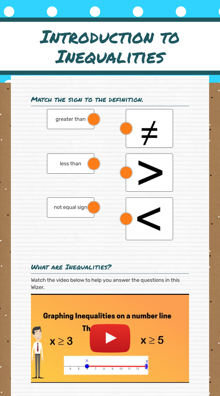 Introduction to Inequalities - Super Teacher Worksheets Super Teacher Worksheets - Introduction to Inequalities ANSWER KEY Single Variable An inequality is a pair of expressions or numbers that are not equal. You can use these signs to express an inequality: > greater than ≥ greater than or equal to < less than ≤ less than or equal to