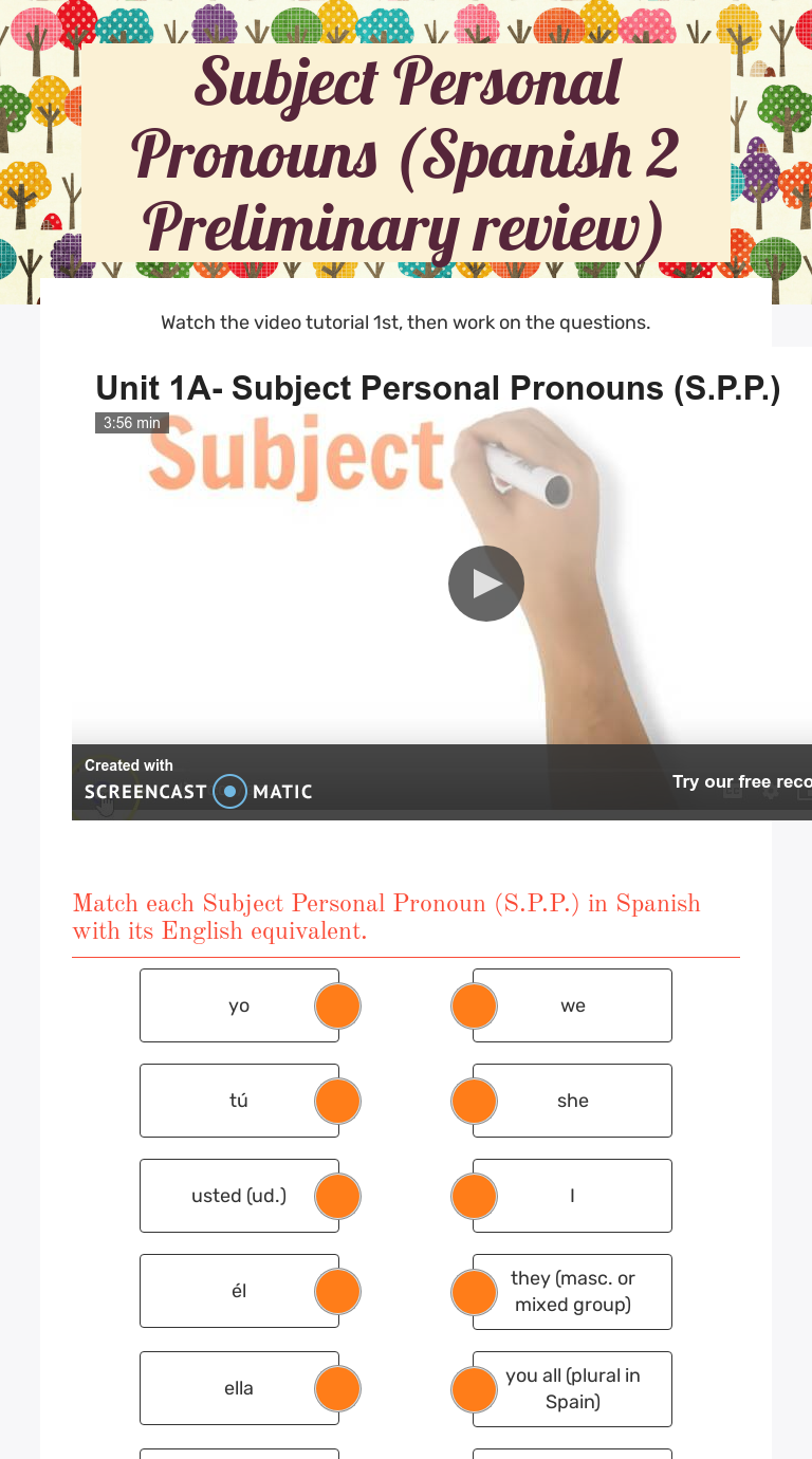 Spanish 1 units plans - Spanish 1 with Señora Groeb- Grammar: Subject Pronouns Video lesson: Tontito Frito - Personal Pronouns PowerPoint Subject Pronouns PPT Subject Pronouns Flashcards Handout: Subject Pronoun Notes Worksheet: Subj. Pronouns. Spanish to English Worksheet: Subject Pronouns English to Spanish Grammar: The verb "Ser" Introduction and Conjugations Video lesson: Ser conjugations and ...