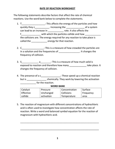 Rates of Reaction Worksheet | PDF | Reaction Rate | Chemical... Rates of Reaction Worksheet - Free download as Word Doc (.doc / .docx), PDF File (.pdf), Text File (.txt) or read online for free. Reaction rate This means that there is a People dancing at a. increases when bigger area of a solid party are more likely a catalyst is exposed, so there is a to bump into each...