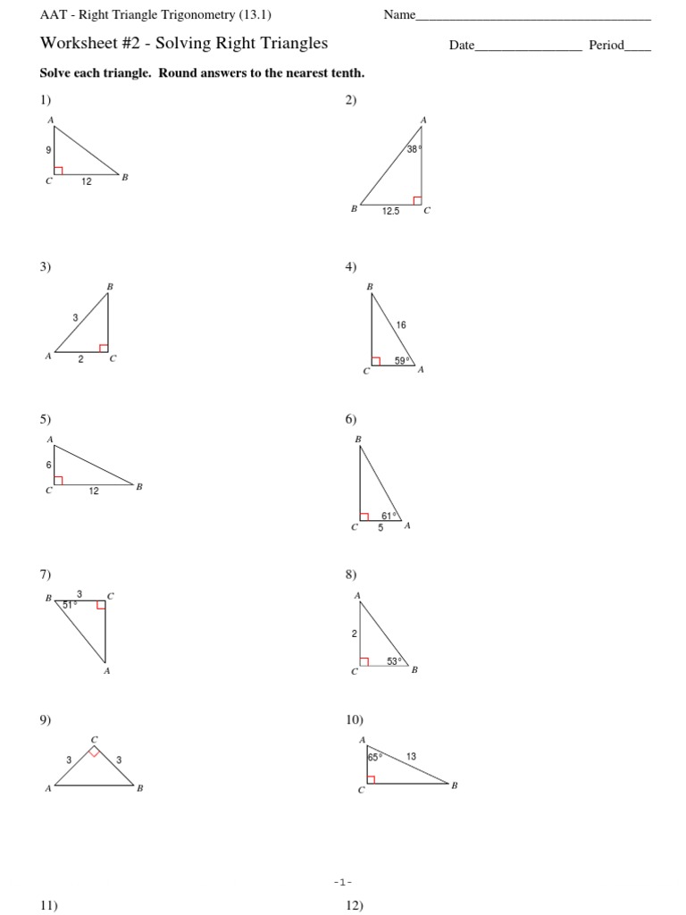 PDF Right Triangle Trig Missing Sides and Angles Solve each triangle. Round answers to the nearest tenth. Create your own worksheets like this one with Infinite Algebra 2. Free trial available at KutaSoftware.com. ©a y290b102B wKZuItbas vSfowfQtYwEa9rQe5 aLAL1CH.j u uAQl3lN Tr0iygohHtCs1 4rAeasSewrYv4eddT.g j kMoaid8e2...