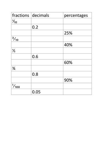 Converting Fractions, Decimals & Percentages Worksheets Help your students get more comfortable with converting fractions, decimals and percentages with these differentiated worksheets. Each version of this worksheet features a series of fractions, decimals and/or percentages lined up in a grid formation. To complete the activity, students must convert each provided number into the other two formats.