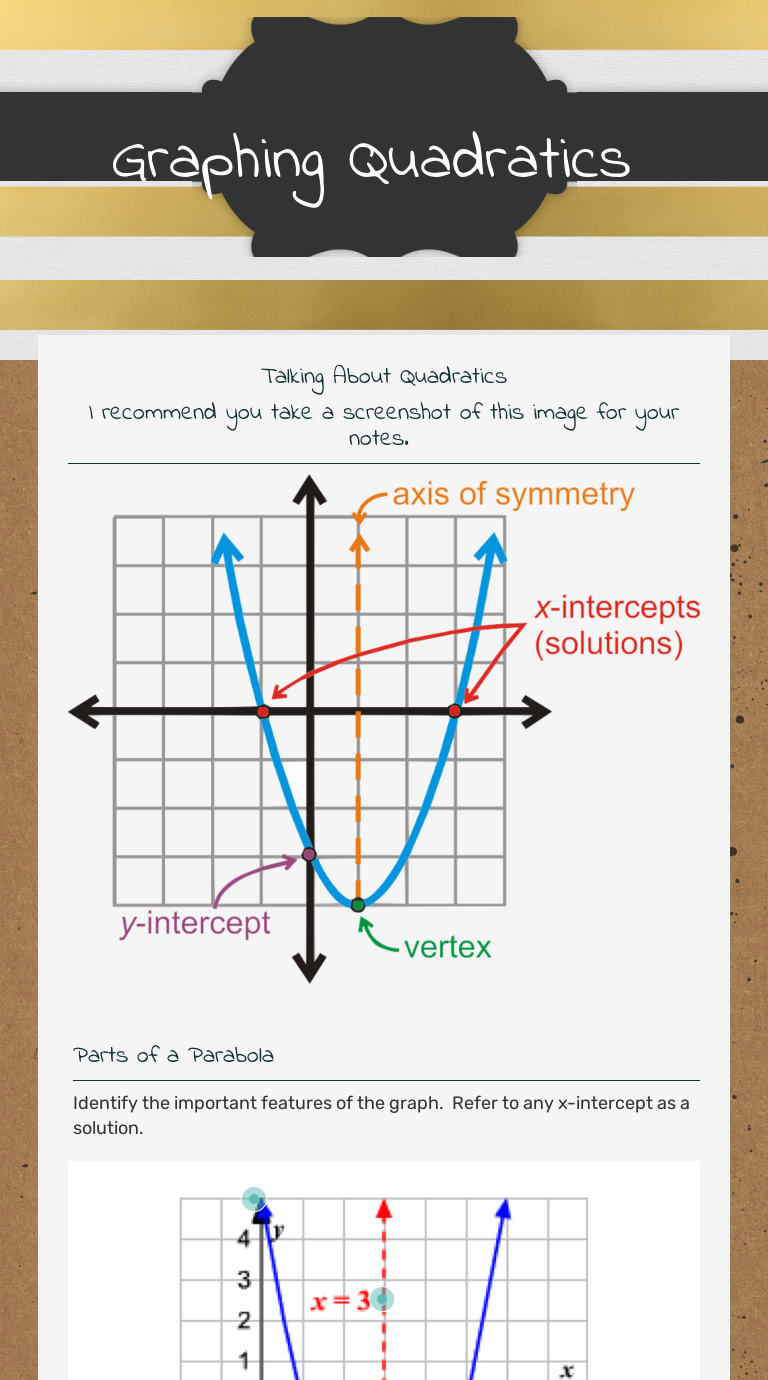 Graphing Quadratics Standard Form.pdf Jeopardy Graphs of Quadratics Graphing Quadratics Solving Quadratics Quadratic Equation Solve Using Best Method 100 200 300 400 500. Name: Period: 10.1 Notes-Graphing Quadratics Notes-Graphing Quadratics . State the maximum or minimum point (vertex), the axis of symmetry...