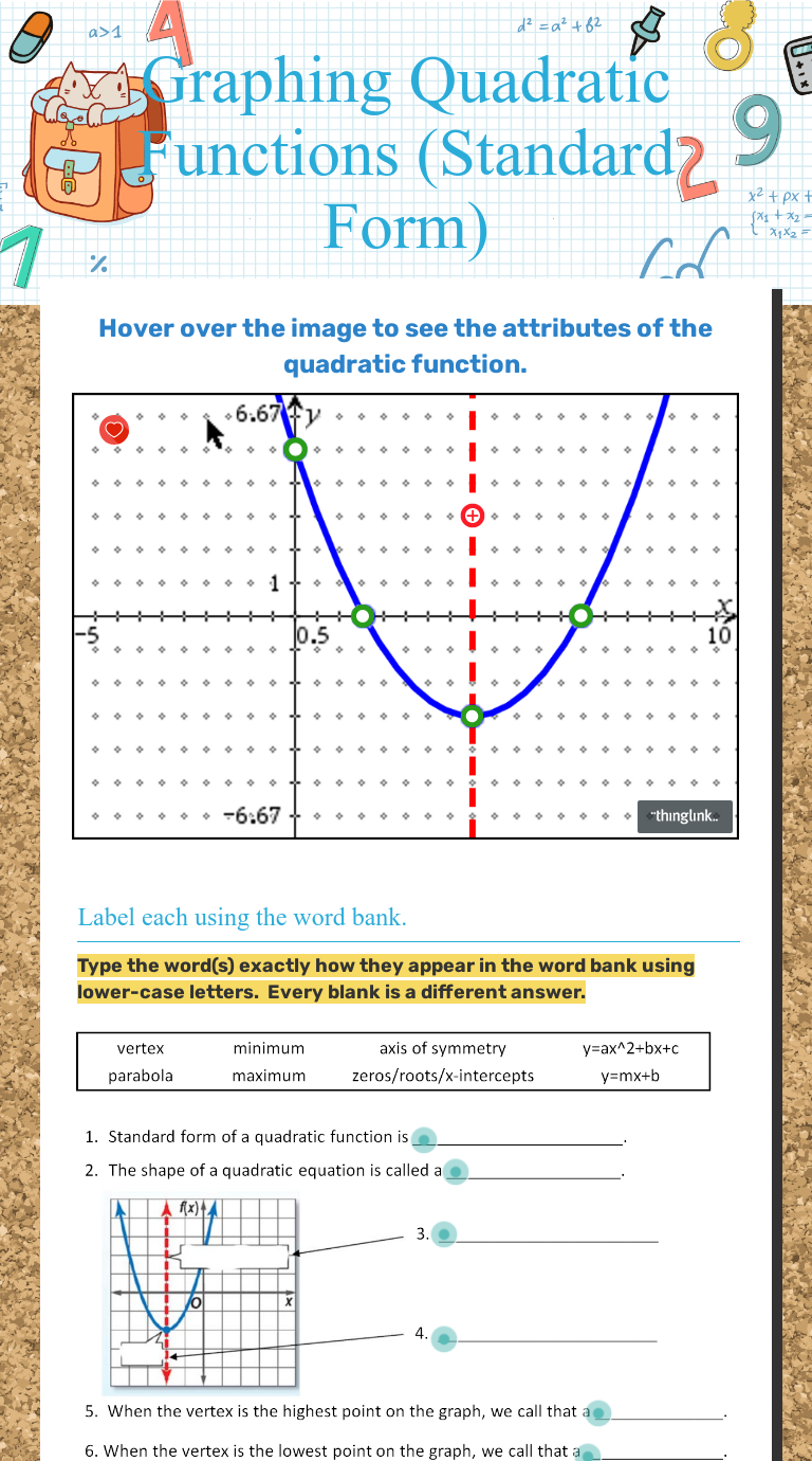 Graphing quadratics in standard form worksheet. Algebra 1 Worksheets | Quadratic Functions Worksheets Graphing Quadratic Inequalities Worksheets This Algebra 1 - Quadratic Functions Worksheet produces problems for graphing quadratic inequalities. You can select the magnitude of the "a" term and the direction in which the parabola opens. These Quadratic Functions Worksheets are a good... Worksheet Graphing Quadratics From Standard Form Worksheets are Title graphing quadratic equations in standard form class, Graphing quadratic, Graphing quadratics review work name, Unit 2 2 writing and graphing This worksheet activity allows students to practice graphing quadratic functions in standard form, and is anything but boring! Quadratic Functions and Their Graphs and is shared by the graphs of all quadratic functions. Note that the graph is indeed a function as it passes the vertical line test. When graphing parabolas, we want to include certain special points in the graph. The y-intercept is the point where the graph intersects the y-axis. Graphing Quadratic Functions (Standard Form) | Wizer.me Hover over the image to see the attributes of the quadratic function. Write instructions here... Create your own worksheet. Start creating - For free! This vertex is a minimum since it is the lowest point on the parabola. The graph of a quadratic function is called a parabola.