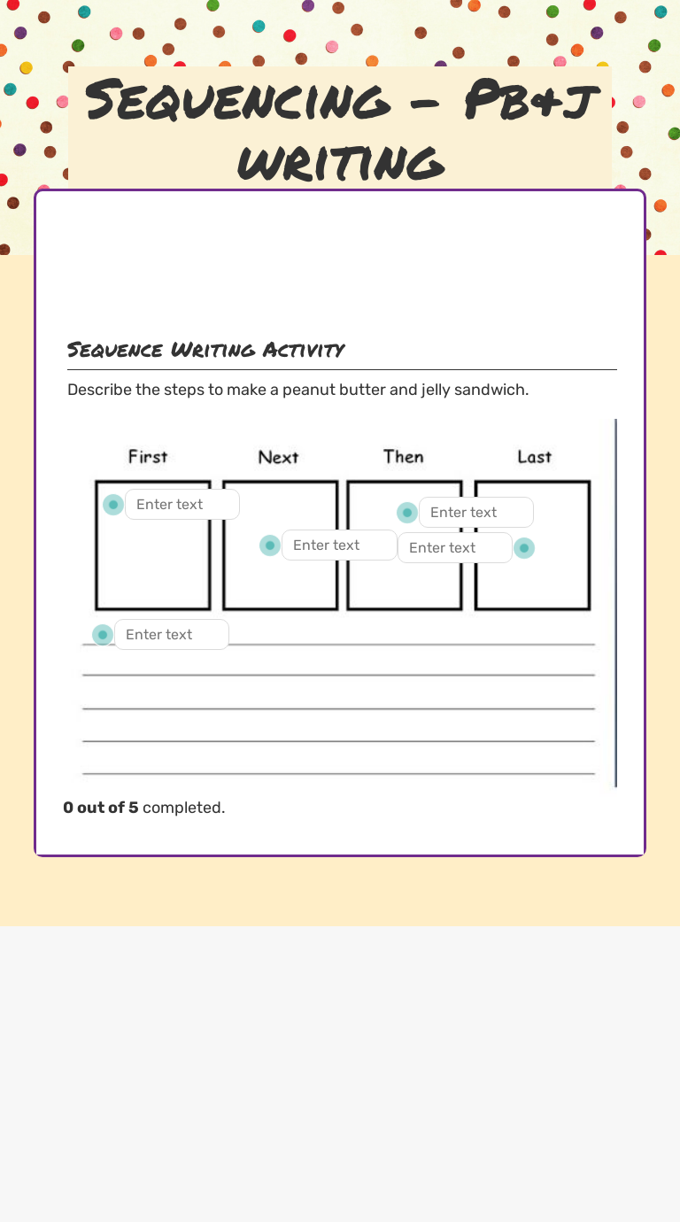 Peanut Butter and Jelly Sandwich Sequencing Activity worksheet Main content: Sequencing steps to make a peanut butter and jelly sandwich Other contents: Add to my workbooks (24) Embed in my website or blog Add to Google Classroom Add to Microsoft Teams Share through Whatsapp