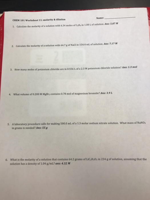 Molarity Problems Worksheet Answers - Worksheet Answer Key Jan 13, 2022 · Molarity Problems Worksheet Answers. It’s not difficult to do what we have set out to do. There are 9 sentences on each worksheet. Read the sentences meticulously then acknowledge the nouns for every paragraph. After correctly recognizing as well as underscoring all of the words in the worksheets, his work is done. Molarity Worksheet - face.edu ANSWER KEY - DILUTION WS. 1. 2. 75.0 mL. 3. 4. 15,000 L or 1.5 x 107 mL. 5. 6. final volume is 375 mL, so you need to add 175 mL. 7. To solve this, work backwards from the final dilution forward: Step 1: #moles in final dilution = 0.0890M x 0.0500L = 0.00445 moles Na2CO3. Step 2: # mole in second dilution . Step 3: Could this be done as a ... PDF Molarity Worksheet 2 The Dilution Equation Answers Download Free Molarity Worksheet 2 The Dilution Equation AnswersAnswer Key Getting the books solutions worksheet 2 molarity and dilution problems answer key now is not type of inspiring means. PDF Molarity Practice Problems #1 1. 3. - All-in-One High School Molarity Practice Problems #1 Answer Key 1. How many grams of potassium carbonate are needed to make 280 mL of a 2.5 M solution? Using the molarity equation (M = mol/L), we can find that we'll need 0.70 mol of potassium carbonate. Given that the molar mass of K2CO3 is 138.21 g/mol, this means that we'll require 97 grams 2.