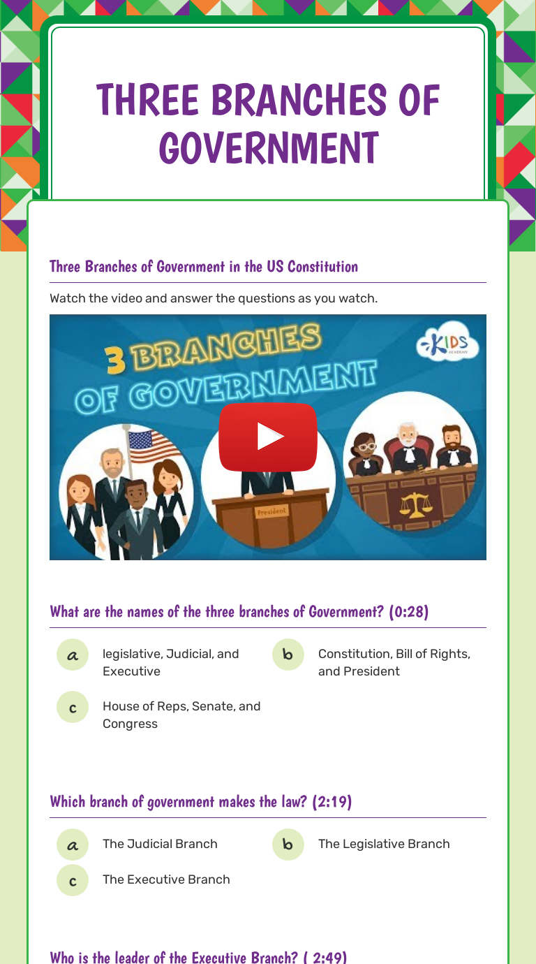 40 3 branches of government worksheet answers - Worksheet ... Worksheets - 3 Branches of Government This worksheet came from Education.com. This worksheet is a fun crossword activity to go along with the 3 Branches of Government. This worksheet came from Education.com. Students could use this sheet as a reading passage and then write a few facts on a separate sheet of paper about what they have learned.