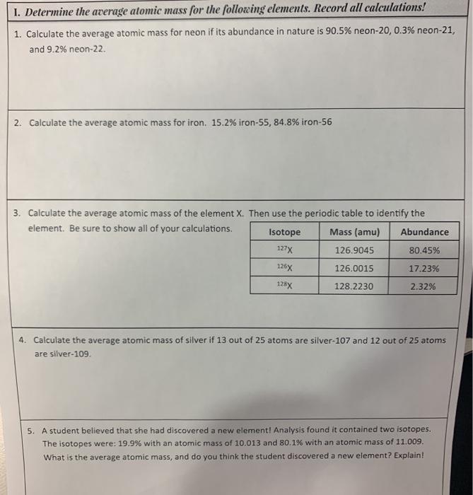 calculating average atomic mass worksheet answers - Zip ... Calculating Average Atomic Mass Worksheet. Students generally abash diminutive number, diminutive mass, diminutive weight and about diminutive mass. The afterward definitions may be helpful: Atomic cardinal is the cardinal of protons in an element. This cardinal is consistently the aforementioned for every atom of a accurate element; it is a axiological acreage of the element. Relative atomic mass worksheet pdf - Australia Examples ... Chemistry: Average Atomic Mass Worksheet Calculate the average atomic mass for each element based on the natural abundance of its isotopes. 1. Find the average atomic mass for Li if 7.5% of Li atoms are 6Li with a mass of 6.0151223 amu and 92.5% are 7Li with a mass of 7.0160041 amu. 2.