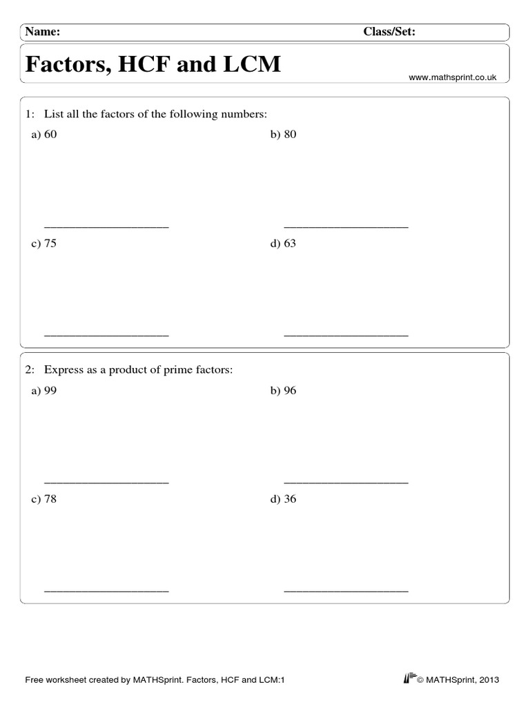 Free worksheets for prime factorization / find factors of ... Create an unlimited supply of free worksheets for prime factorization or for finding all the factors of the given numbers. The worksheets are available in both html and PDF formats (both are easy to print), and they come with an answer key on the second page of the file. Each worksheet is randomly generated and thus unique.