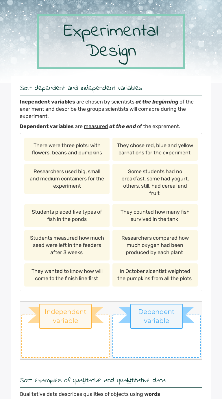 Experimental Design Worksheet | Teachers Pay Teachers Experimental Design Worksheet by Danis Marandis 24 $2.99 Word Document File This is a worksheet meant to help students practice labeling experiments with appropriate terminology from the scientific method--independent variables, dependent variables, experimental groups, control groups, and confounding variables.
