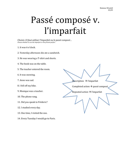 Passé Composé vs. imparfait worksheet | Teaching Resources A worksheet for students to choose use of Passé Composé or Imparfait. Subject: French. Age range: 14-16. Resource type: Worksheet/Activity.
