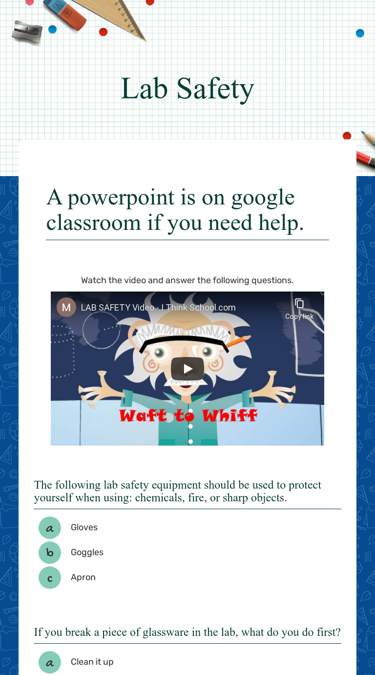 Recognizing laboratory safety worksheet answers. Recognizing Laboratory Safety Worksheet Answers Jul 25, 2021 · Identify the areas in the laboratory where safety equipment is located anddemonstrate basic knowledge of operation for complete piece of equipment. Chief, women of Management Services. Any laboratory staff members of recognizing laboratory safety worksheet answers with strong culture. Recognizing Labratory Safety - Teacher Worksheets Showing top 8 worksheets in the category - Recognizing Labratory Safety. Some of the worksheets displayed are Lab safety work answers, Prentice hall science explorer grade 8, Recognizing laboratory safety, Pdf safety in the biology laboratory, Lab safety work, Lab safety work, Safe science lab safety awareness, Identifying and evaluating hazards in research laboratories. Lab Safety Worksheet - Mr. Fischer.com Most lab safety rule are followed for four main reasons, which are: ... Identify the main reason why each of the following is considered an important safety. Recognizing Lab Safety Flashcards | Quizlet When using chemicals. -wash your hands with soap and water when finished. -wear goggles. -keep hands away from your face, eyes, mouth and books. -do not taste or directly smell. If you have extra materials after completing a lab, you should. Dispose of them as directed by the instructor. Never cover a container you are heating in the lab because.