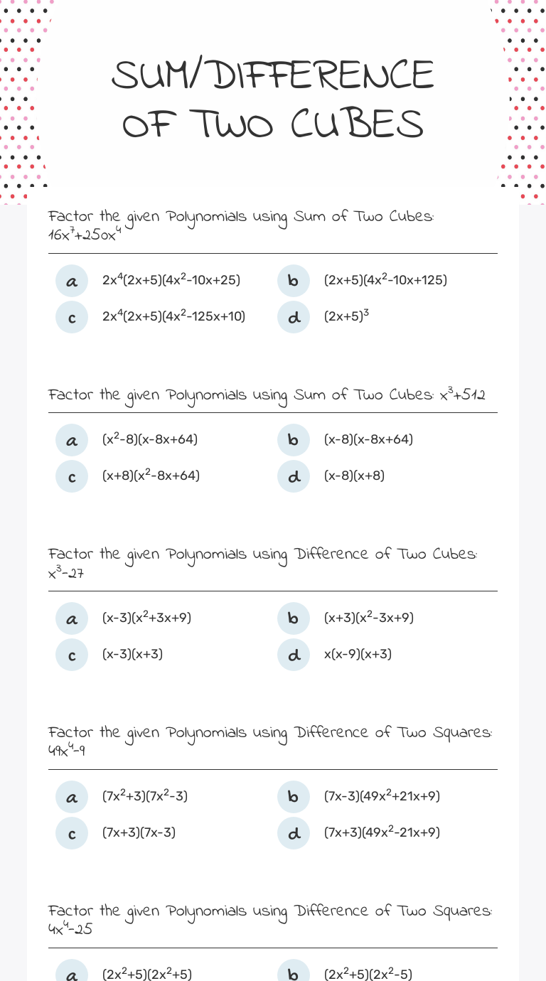 Sum And Difference Of Cubes Worksheets - Kiddy Math Some of the worksheets for this concept are Factoring a sumdifference of cubes, Factoring the sum or difference of cubes, Sum and difference of cubes practice work, Factoring the sum or difference of two cubes, The sum and difference of two cubes, Special factoring formulas, Angle sumdifference identities, Factoring binomials. Sum and Difference of Cubes Factoring Worksheet by Kuta Software LLC. Answers to Sum & Difference of Cubes Factoring. 1) (2x − 1)(4x. 2 + 2x + 1). 2) 3(x + 4)(x. 2 − 4x + 16). 3) 4(5x + 3)(25x.2 pages PDF Factoring the Sum or Difference of Two Cubes Factoring the Sum or Difference of Two Cubes Factor completely. 1) x3 + 1 2) y3 − 8 3) z3 − 64 4) m3 + 27 5) 1 − t3 6) 125 + w3 7) 8 − z3 8) 1000 − n3 9) 8x3 + 27 10) 64 − 27b3 11) 8m3 − 27r3 12) 125a3 + 8b3. Answers to Factoring the Sum or Difference of Two Cubes Sum And Difference Of Cubes Worksheet - worksheet Sum and difference of two cubes displaying top 8 worksheets found for this concept. In this 5 worksheet pack levels 1 3 1 quiz 1 bonus worksheet students will factor sums and differences of cubes they will solve for cube roots and find all roots of polynomial equations by factoring the sum and difference of cubes then solving for the roots from ...