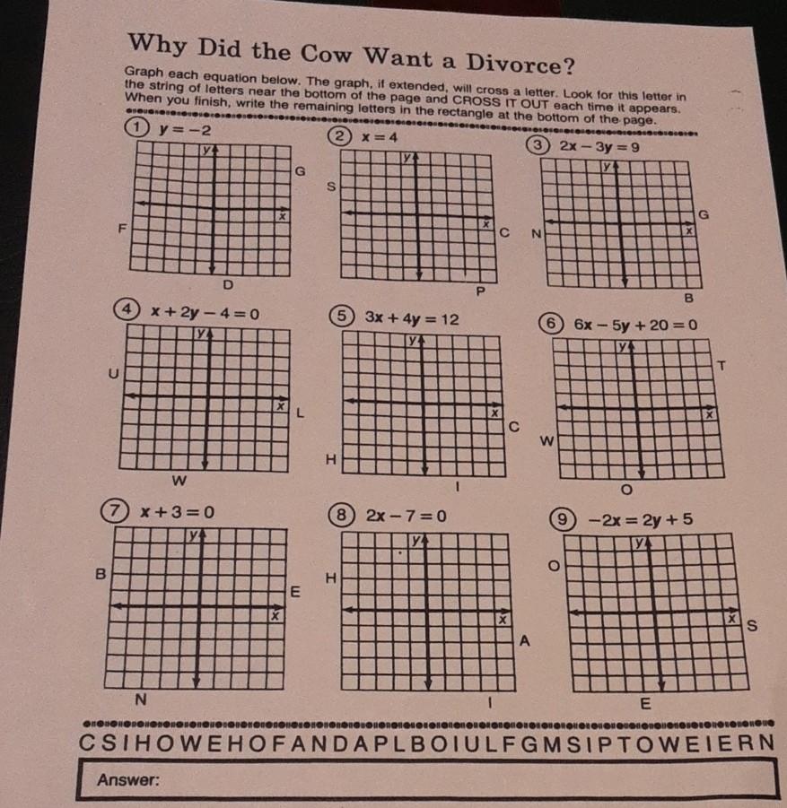 Celebrities Archives - Hollywood.com Click to get the latest Celebrities content. Sign up for your weekly dose of feel-good entertainment and movie content! razanac-tzo.net › why-did-the-cow-want-a-divorce-answer-keyWhy Did The Cow Want A Divorce Answer Key › Free Worksheet by ... This is the math worksheet why did the cow want a divorce section. 4 x 2y-4O c 3x4y12 8 2x-7o 3 2x. Graph each equation below the graph if extended will cross a letter. Showing top 8 worksheets in the category answer key for commas. Why did the cow want a divorce math worksheet answers. True False x 3. Name's What Did the Ape Think of the Grape's House? Why Did the Cow Want a Divorce? T. Graph each equation below. The graph, if extended, will cross a letter. Look for this letter in.4 pages