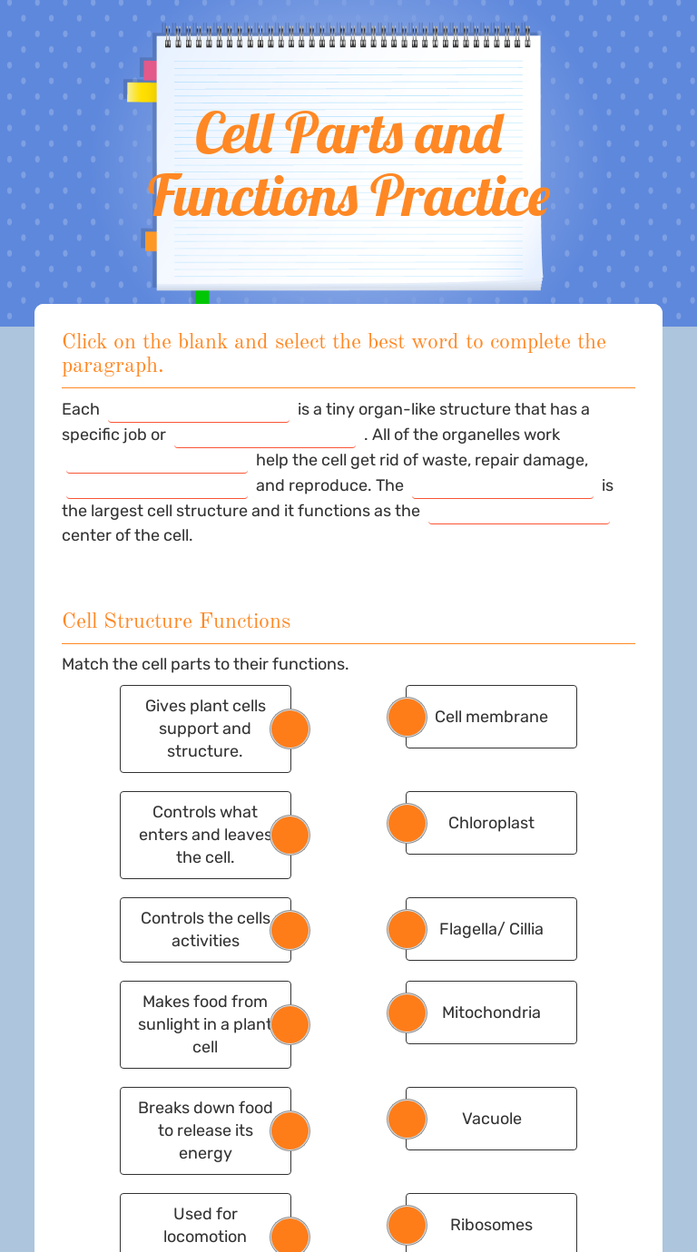 Cell Membrane Structure And Function Worksheet Answer Key ... Cell Membrane Structure And Function Worksheet Answer Key If you recognize with a couple of common plural nouns, this job needs to be a piece of cake. Specific aspects should be coupled with appropriate cumulative noun groups for 2nd . To obtain a sense of what really takes place, the very first trouble is fixed. Grade 8 Cell Structure and Functions ... - WorkSheets Buddy Nov 10, 2020 · 1. The cell wall is made of a non-living material known as: (a) chromosome (b) nucleic acid (c) cellulose (d) protoplasm. 2. Food-making structures found in the cells of green plants are called: (a) chloroplasts (b) chromosomes (c) mitochondria (d) chromoplasts. 3. Cells which are long and branched are: (a) muscle cells (b) nerve cells (c) red blood cells (d) ostrich egg cells. 4. DOCX Cell Organelles Worksheet - Cabarrus County Schools Cell Organelles Worksheet. Complete the following table by writing the name of the cellorganelle in the right hand column that matches the structure/function in the left hand column. Structure/Function. Cell Part. Stores material within the cell. The sites of protein synthesis. Cell Structure And Function Worksheet - Live Worksheets Online Cell Structure And Function Worksheet - A child's capacity to distinguish between normal and also abnormal food is critical.An integral part of daily life, not an instructional demand, is to grow the routine of self-reflection However, this can be a tedious and even gloomy endeavor.
