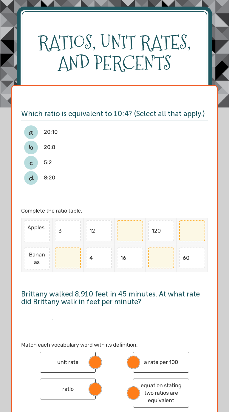 Ratios and unit rates worksheet. Unit Rates Practice worksheet Live worksheets > English > Math > Ratios > Unit Rates Practice. Unit Rates Practice. Practice unit rate. ID: 2487288. Language: English. School subject: Math. Grade/level: 6. Age: 10-11. Main content: Ratios. Ratios And Unit Rates Worksheet Answer Key Rate This Unit Rate Worksheets | Math Worksheets Free worksheets including unit rates, writing ratios, tables, and graphs. Answer keys and examples come with each printable worksheet. an answer key is provided with each free worksheet! Writing Ratios Worksheet 1 - With this 20 problem worksheet, you will practice writing ratios in three different ways ... Ratio And Rate 6th Grade Worksheets - K12 Workbook Displaying all worksheets related to - Ratio And Rate 6th Grade. Worksheets are 6th grade math ratios and proportions notes, Grade 6 ratio word problems a, Ratio and proportion grade 6, Mathlinks grade 6 student packet 11 ratios and unit rates, Mathematicsgrade 6 unit 3 rates and ratios, Find the unit prices 6th grade ratio work, Grade 6 ratios word problems, Ratio rate and proportions practice. Rates and Unit Rates Worksheets with Word Problems Unit Rate Worksheets with Word Problems Help students of grade 5 through high school to heighten their logical reasoning with this batch of meticulously drafted unit rate worksheets. Over 60 plus well-researched word problems based on unit rates, unitary method and comparing unit rates are featured here!