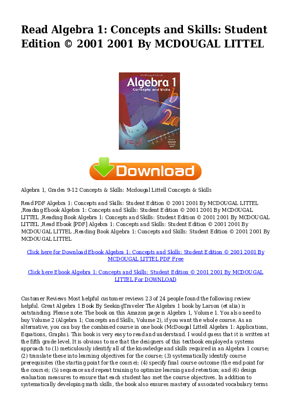 Mcdougal littell algebra 1 worksheet answers. Mcdougal littell algebra 1 textbook answers Algebra1help.com contains insightful material on mcdougal littell algebra 1 textbook answers, function and matrix algebra and other math subjects. In case that you need help on roots or perhaps college algebra, Algebra1help.com is really the perfect place to go to! McDougal Littell Algebra 1 answers & resources | Lumos ... Use the table below to find videos, mobile apps, worksheets and lessons that supplement McDougal Littell Algebra 1. Ch 1. McDougal Littell Algebra 1 Chapter 1: Expressions, Equations & Functions. Lesson 11 - What Is Domain and Range in a Function? Ch 2. PDF Mcdougal Littell Algebra 1 Practice Workbook Answer Key Read Online Mcdougal Littell Algebra 1 Practice Workbook Answer Keyin right site to start getting this info. acquire the mcdougal littell algebra 1 practice workbook answer key link that we have enough money here and check out the link. You could purchase guide mcdougal littell algebra 1 practice workbook answer key or get it as soon as ... PDF Mcdougal Littell Algebra 1 Answers Answers Mcdougal Littell Algebra 1 Answers This is likewise one of the factors by obtaining the soft documents of this mcdougal littell algebra 1 answers by online. You might not require more mature to spend to go to the book establishment as capably as search for them. In some cases, you likewise reach not discover the publication mcdougal ...