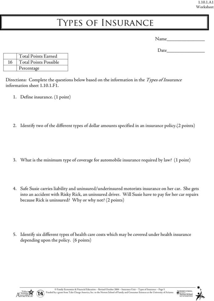 PDF Types of Insurance lesson plan 1.10 - Weebly The Insurance Investigation Rubric 1.10.1.B1 will be used to grade this assignment. 4. Turn in your essay, the Insurance Investigation Rubric 1.10.1.B1, and this worksheet. Please sign below if the student engaged you in a meaningful discussion regarding the topic of insurance. Name of Adult: PDF 1.10.1.F1 Types of Insurance - Ms. Christy Garrett Ann ... Government insurance programs also can address speciļ¬c catastrophes, such as the aid provided for vic ms a Ler Hurricane Katrina hit New Orleans in 2005. Type of Insurance Examples of Risks Covered (depending upon the policy purchased) Provided by Notes Health Provides money to pay for health care for illness, injury, Financial Literacy Reading Comprehension Worksheet Types ... This passage explains the different types of insurance. Students read 14 scenarios and identify the type of insurance needed. INCLUDES:Covers the types of insurance14 scenarios for students to identify the type of insurance needed Color and BW versionsKeys included at endPart of my Financial Litera... Types of Insurance review worksheet.docx - Types of ... Types of Insurance Name_____ Directions: Match the correct term with the correct definition by placing the letter on the appropriate blank. 1. _____ A financial product purchased by many people facing a similar risk to protect against the risk of larger losses 2. _____The money paid to an insurance company to purchase a policy 3. . _____The chance of loss from an event that cannot be entirely ...