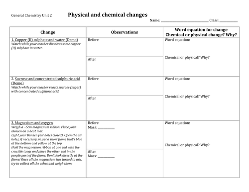 Physical vs chemical changes worksheet. Physical And Chemical Properties Changes Worksheet Answers Physical and Chemical Changes Worksheet Apr 14, 2020 · 4 Physical and Chemical Properties. The PFAS Team developed a training module video with content related to this section, it is the Naming Conventions and Physical and Chemical Properties video.. Chemical Vs Physical Properties Worksheets - Learny Kids Displaying top 8 worksheets found for - Chemical Vs Physical Properties. Some of the worksheets for this concept are Physical and chemical changes work, Physical and chemical properties changes work, Physical and chemical properties of matter, Physical and chemical changes work, Work 2 physicalchemical name propertieschanges, Structure and properties of matter, Physical and chemical change ... Forest Hills High School 2017-09-25 · PHYSICAL VS. CHEMICAL CHANGE Name In a physical change, the original substance still exists, it has only changed in form. Energy changes usually do not accompany physical changes, except in phase changes and when substances dissolve. In a chemical change, a new substance is produced. Energy changes always accompany chemical … Physical Vs Chemical Change Teaching Resources | TpT Chemical VS Physical Properties and Changes Worksheet for Review or Assessment by Science from the South 15 $3.50 PDF Use this activity for reviewing or assessing your students understanding of chemical and physical properties and changes. Assign for homework, an in class activity, or even as a quick quiz.