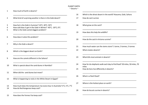 BBC Planet Earth Ice Worlds - Documentary Question ... BBC Planet Earth Ice Worlds - Documentary Question & Answers Sheet. Subject: Geography. Age range: 11-14. Resource type: Worksheet/Activity. (no rating) 0 reviews. Teach Geography! 4.25 12 reviews. Engaging, structured and differentiated resources and displays for teaching KS3, KS4 and KS5 geography (AQA specification).
