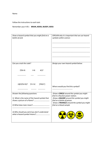 Hazard-safety symbols worksheet Hazard-safety symbols Fill in the blank exercise on hazardous symbols ID: 1635196 Language: English School subject: Science Grade/level: 7 ... More Hazard symbols interactive worksheets. Hazard SYmbols by nicolegrech90: Hazard symbols by RozanK: Hazard symbols by RozanK: Topical Assignment 1 Hazard Symbols