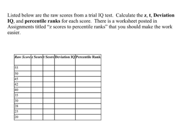 DOC Z-Score Practice Worksheet Z-Score. A normal distribution of scores has a standard deviation of 10. Find the z-scores corresponding to each of the following values: A score of 60, where the mean score of the sample data values is 40. A score of 80, where the mean score of the sample data values is 30. A score of 20, where the mean score of the sample data values is 50.