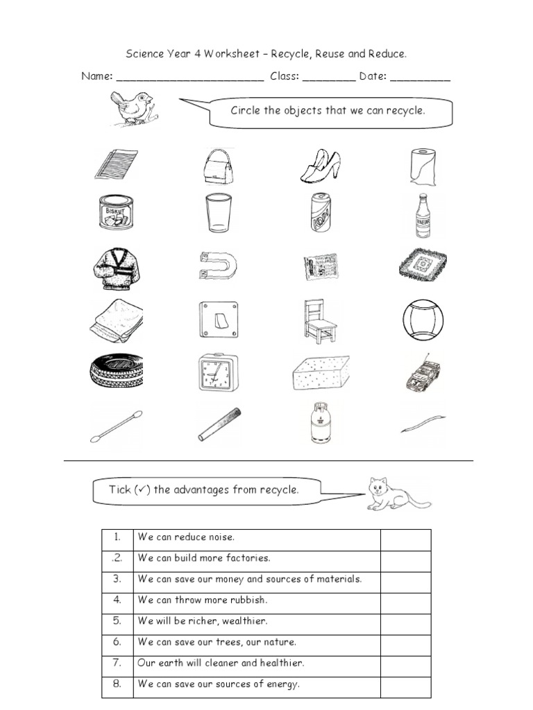 Reduce, reuse and recycle worksheets | K5 Learning Environment Reduce, reuse and recycle Reduce, reuse and recycle Environment worksheets: the three Rs Following the three R's (reducing material usage, reusing materials and recycling used materials) helps us protect the environment. Students identify which of the three R's is the best way to deal with each item pictured. Worksheet #1 Worksheet #2