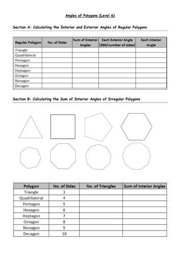 Resourceaholic: Shape Triangle angles worksheet - Ed Southall; Angles in triangles and quadrilateral questions - @taylorda01; ... Quadrilateral & Polygon Properties. Interior Angles of Polygons - Math is Fun If it is a Regular Polygon (all sides are equal, all angles are equal) Shape Sides Sum of Interior Angles Shape Each Angle; Triangle: 3: 180° 60° Quadrilateral: 4: 360° 90° Pentagon: 5: 540° 108° Hexagon: 6: 720° 120° Heptagon (or Septagon) 7: 900° 128.57...° Octagon: 8: 1080° 135° Nonagon: 9: 1260° 140°..... Any Polygon: n (n−2 ...