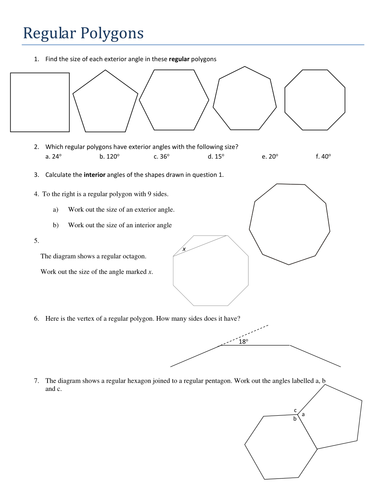 Angles of polygon worksheet. Interior Angles, Exterior Angles and the Sum | Polygon Worksheets The sum of the exterior angles at each vertex of a polygon measures 360 o. Divide 360 by the number of sides, to figure out the size of each exterior angle in this unit of regular polygons pdf worksheets for 8th grade and high school students. Angles Worksheets This far-from-exhaustive list of angle worksheets is pivotal in math curriculum. Whether it is basic concepts like naming angles, identifying the parts of an angle, classifying angles, measuring angles using a protractor, or be it advanced like complementary and supplementary angles, angles formed between intersecting lines, or angles formed in 2D shapes we have them all covered for students ... Lines and Angles Worksheets | Download Worksheet PDF - BYJUS Learn: Lines and Angles. Lines and angles worksheets for class 7 and 9 students are excellent sources who wish to develop and enhance their skills in angles. These worksheets have concepts such as identifying the names of angles, lines, classifying lines and angles, measuring angles and other exciting concepts. Regular Polygons - Properties Area of Polygon = n × side × apothem / 2. And since the perimeter is all the sides = n × side, we get: Area of Polygon = perimeter × apothem / 2. A Smaller Triangle. By cutting the triangle in half we get this: (Note: The angles are in radians, not degrees)