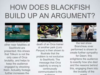 Film Study Worksheet for Blackfish - Course Hero Film Study Worksheet for Blackfish Read the questions before you watch the film so that you will know what to look for while you watch. Complete the assignment by answering each question in paragraph form. Answers need to be complete and comprehensive, demonstrating that you paid attention to the film and thought about what was shown on the screen. Film Study Worksheet for Blackfish SHORT ANSWER QUESTIONS Film Study Worksheet for Blackfish SHORT ANSWER QUESTIONS (5-10 points) List three compelling facts described in the film that reinforce the film's position on Orcas being held in captivity. (5 pts)List three compelling facts related to the film's claim that trainers were misled about the risks of their job and that SeaWorld did not provide […] PDF 'BLACKFISH' STUDY GUIDE DolphinProject 'BLACKFISH' STUDY GUIDE DolphinProject.com For more information, visit DolphinProject.com Grades 3-5 Synopsis 'Blackfish' is a documentary that exposes what life is like for killer whales in captivity. It mainly focuses on Tilikum, a whale owned by SeaWorld Orlando, and his involvement in the death of Dawn Brancheau and two other people. The film