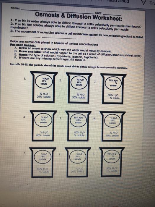 And Diffusion Worksheet Page Answers Osmosis 2 Key Worksheet Osmosis Jones Worksheet Answers Luizah Worksheet And from Osmosis Worksheet, source:guillermotull diffusion and osmosis worksheet answers key page 2, diffusion through a membrane lab teacher guide, Diffusion Through A Membrane . This worksheet was designed for an introductory biology course to reinforce concepts related … Osmosis and Diffusion Worksheet (Answer Key).pdf - Name: Name: _____ Class: _____ Date: _____ Diffusion and Osmosis Introduction Diffusion is the movement of molecules from high to low concentration. This is a natural phenomenon that is constantly occurring around you. For example, if someone were to spray perfume in a corner of the classroom, those molecules of perfume would gradually diffuse through the rest of the room and the other students ... Diffusion, Osmosis, and Tonicity Practice Worksheet Exocytosis. Solutes diffuse across a plasma membrane through a transport protein down their own concentration gradients. facilitated diffusion. Property of allowing some substances but not others to cross a plasma membrane. selective permeability.