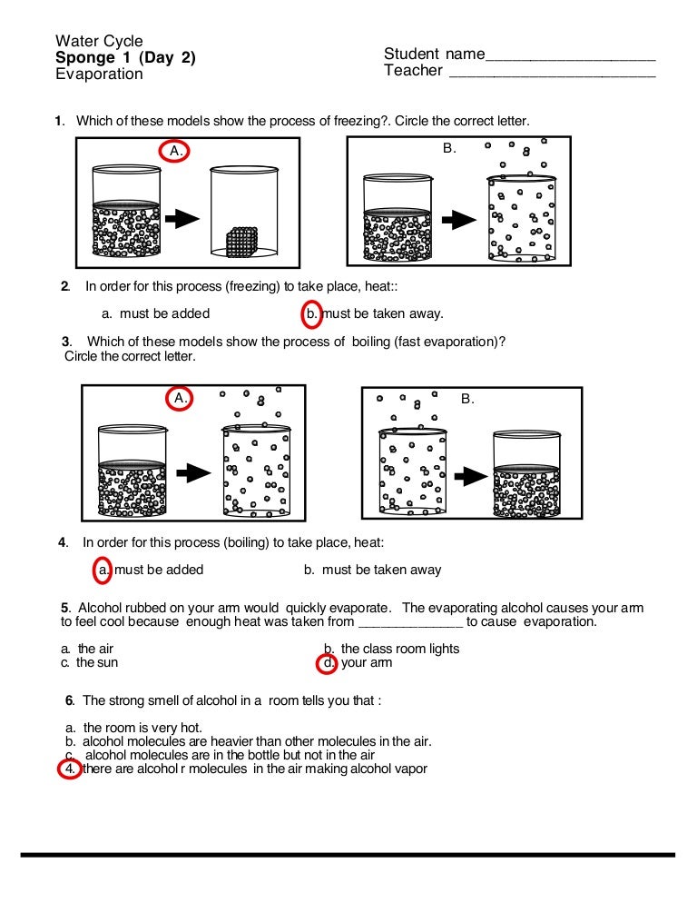 The water cycle worksheet answers. Water Cycle Worksheet Answer Teaching Resources | TpT - TeachersPayTeachers The Water Cycle Worksheet and Answers by Miss Doherty 4.9 (15) $2.50 Word Document File This activity works well when projected onto a whiteboard and writing in the answers together with the class while discussing the purpose of each part of the Water Cycle. Answer sheet is included. Lab Safety Worksheet | Carolina.com This worksheet can help students understand safe lab practices and good techniques. ... water, living organisms, the atmosphere, and beyond. Mine activities, information, and helpful hints for ESS. ... You have questions-we have answers. Get general information, care guides, and product information here. The water cycle | 5th grade Science Worksheet | GreatSchools The water cycle. Evaporation is the process of changing from liquid to gas. Condensation is the process of changing from gas to liquid. Both are part of the water cycle. In this science worksheet, your child determines whether statements about the water cycle are true. SCIENCE | GRADE: 5th. Print full size. Rocking the Rock Cycle (Part 1 of 3) - NASA section on their Color the Rock Cycle Worksheet. 7. Now fold the foil into a boat shape (with the sedimentary rock inside). While they are doing this, go around and fill one of their cups with hot water from the teakettle. 8. When they have their cup of hot water, have students float their boat on the water and observe their sedimentary rocks.