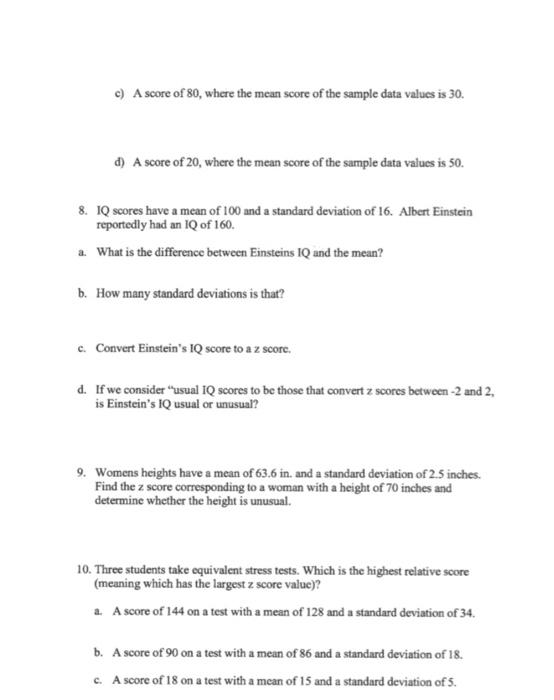DOC Z-Score Practice Worksheet - Chino Valley Unified School District Z-Score Worksheet A normal distribution of scores has a standard deviation of 10. Find the z-scores corresponding to each of the following values: A score of 60, where the mean score of the sample data values is 40. A score that is 30 points below the mean. A score of 80, where the mean score of the sample data values is 30.